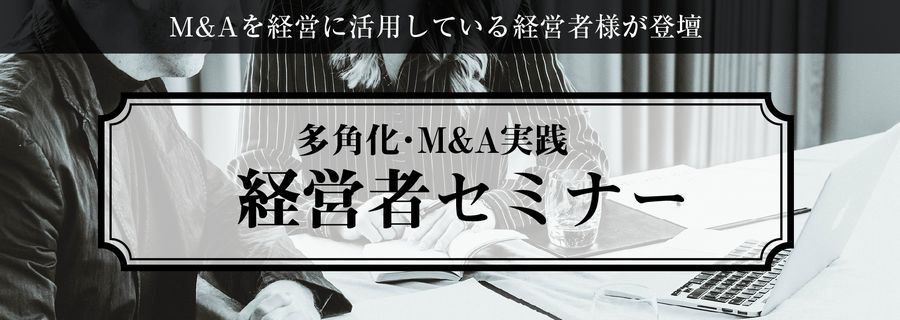 毎月第1週に開催する“多角化・M&A実践経営者セミナー”は、M&Aを経営に活用している経営者様をお呼びし、中小企業のM&A活用事例を紹介。