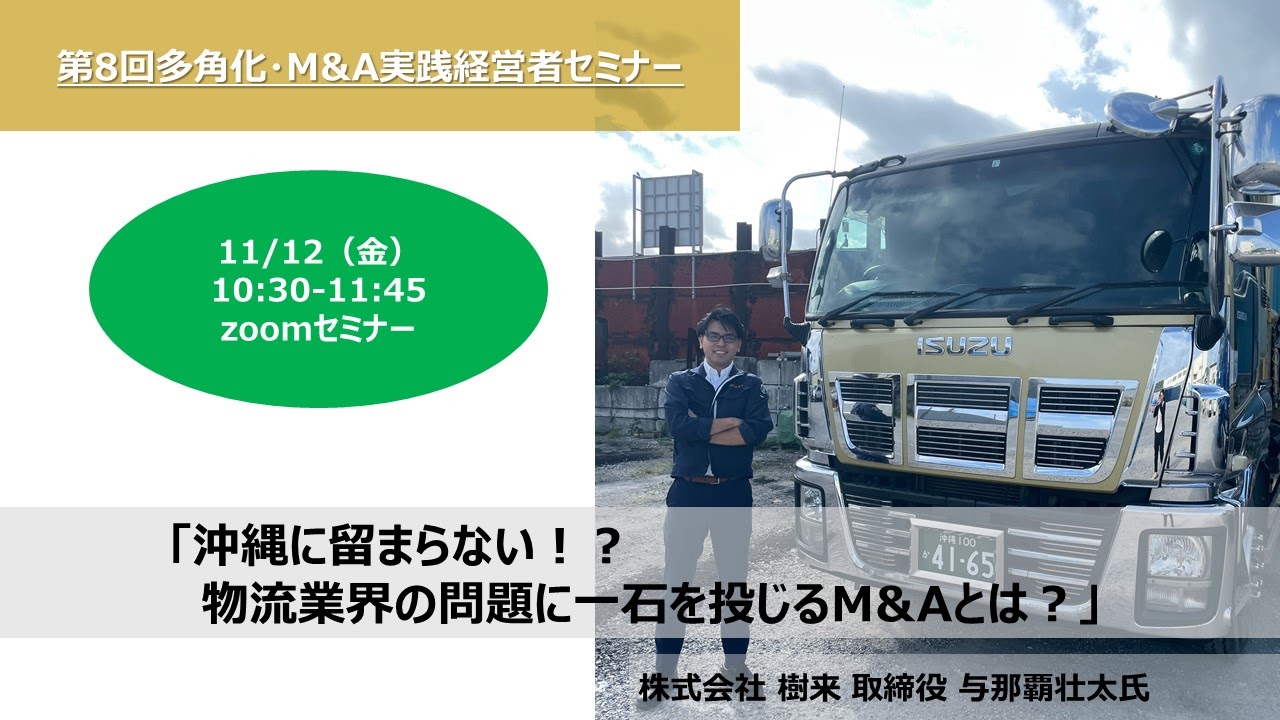 今回は株式会社樹来 取締役 与那覇 壮太様に登壇いただき、「沖縄に留まらない!?物流業界の問題に一石を投じるM&Aとは?」について語っていただきます。株式会社 樹来はもともとご家族が創業され、沖縄県内にてお弁当の「ほっともっと」FC事業、コインランドリー運営などの業務を運営していました。与那覇氏が取締役就任後、運送部を立ち上げて土木、産業廃棄物の運搬業を新たに開始。さらに今年TRANBIで事業買収を行い、県内の物流DXを促すべく「県内初の物流マッチングサイト」の実現を推進されています。