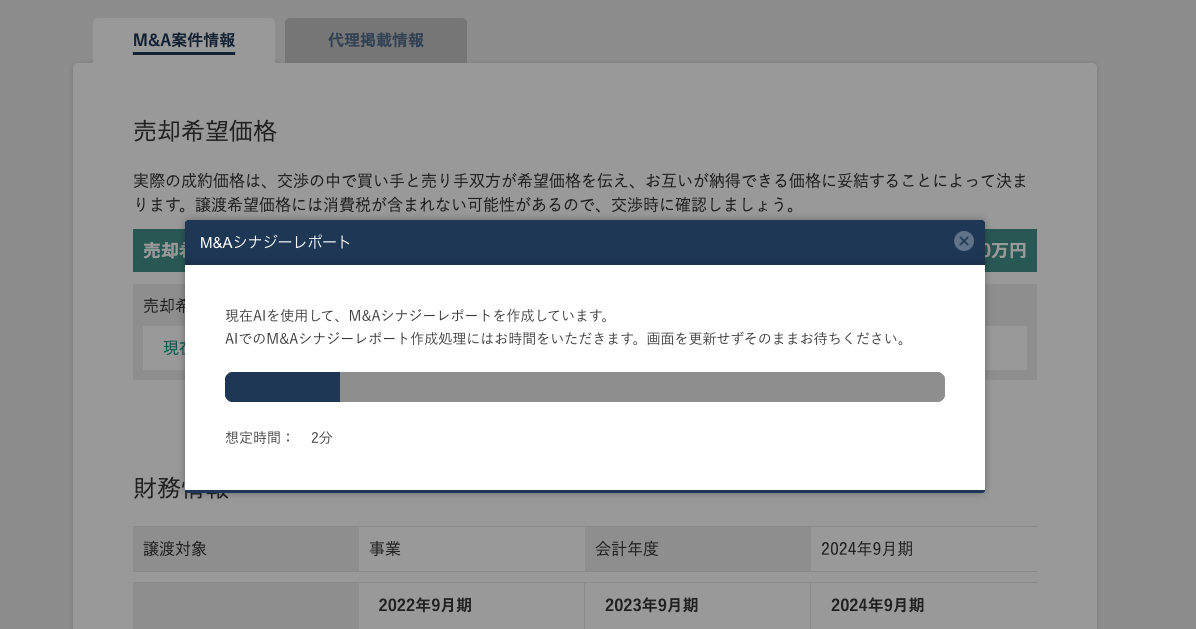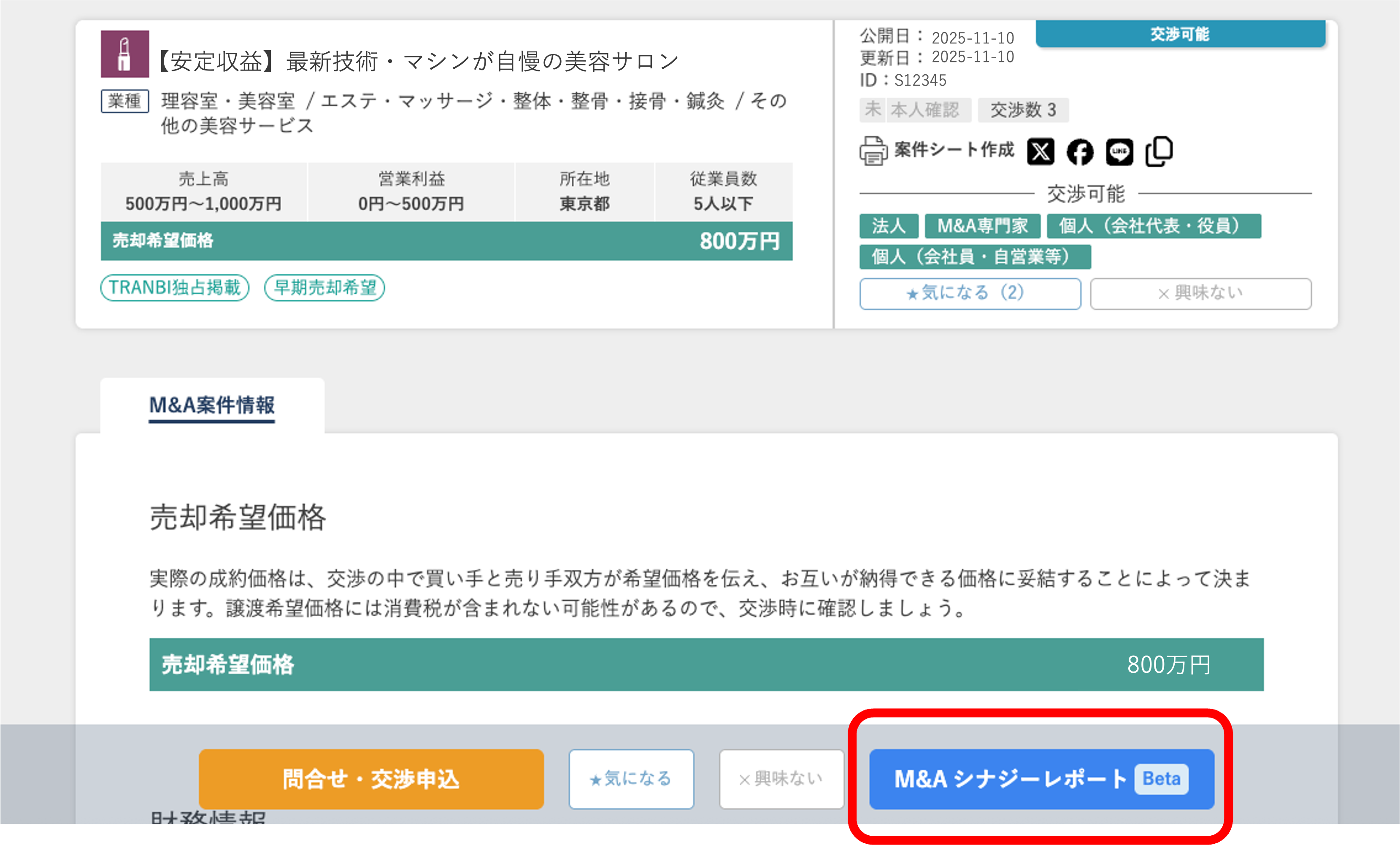 ①ログインして気になる売却案件のページを開き、「M&Aシナジーレポート」ボタンをクリックしてご利用ください。
