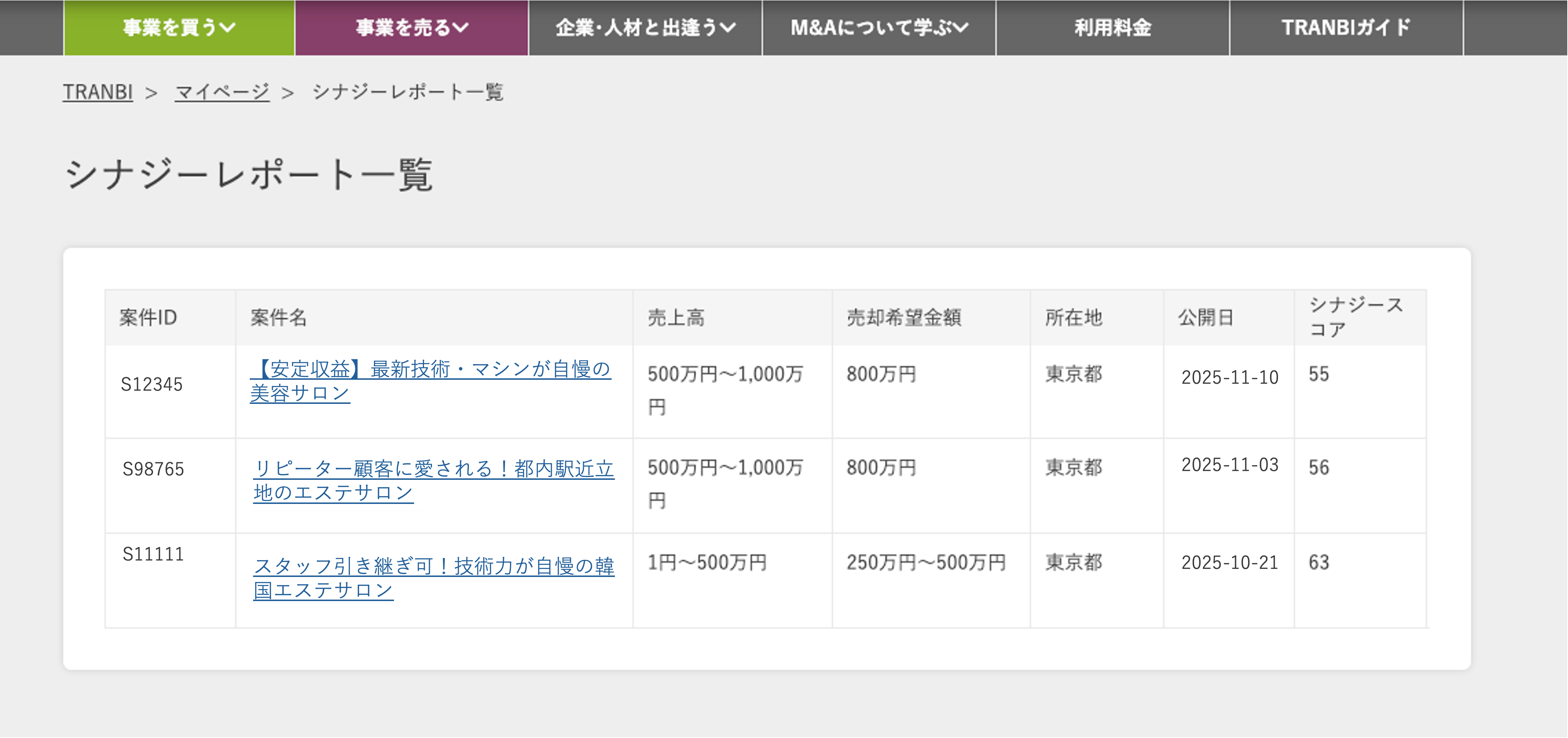 一度レポート作成を行うと、検討している案件の情報について「案件名」「売上高」「売却希望金額」「シナジースコア」等が一覧化されます。これにより、現在検討中の案件の比較検討がしやすくなります。