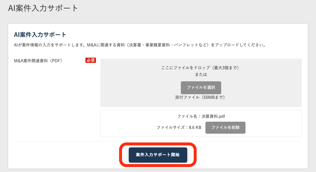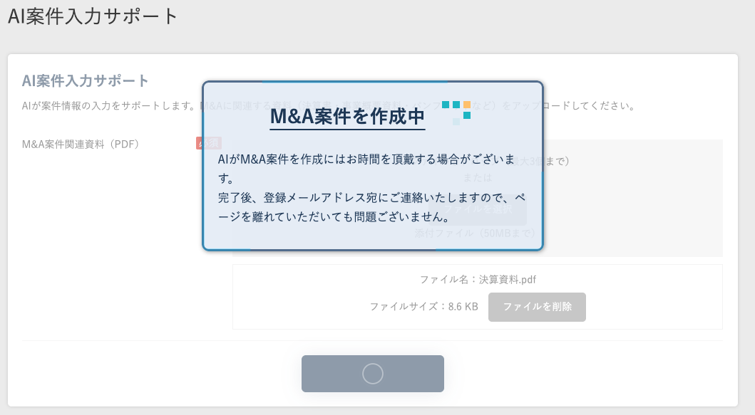 「2. AI案件登録」を選択すると、M&Aに関連する資料(決算書・事業概要資料・パンフレットなど)をPDFでアップロードいただくことで、AIが内容を読み取り、案件情報の文案作成をサポートします。