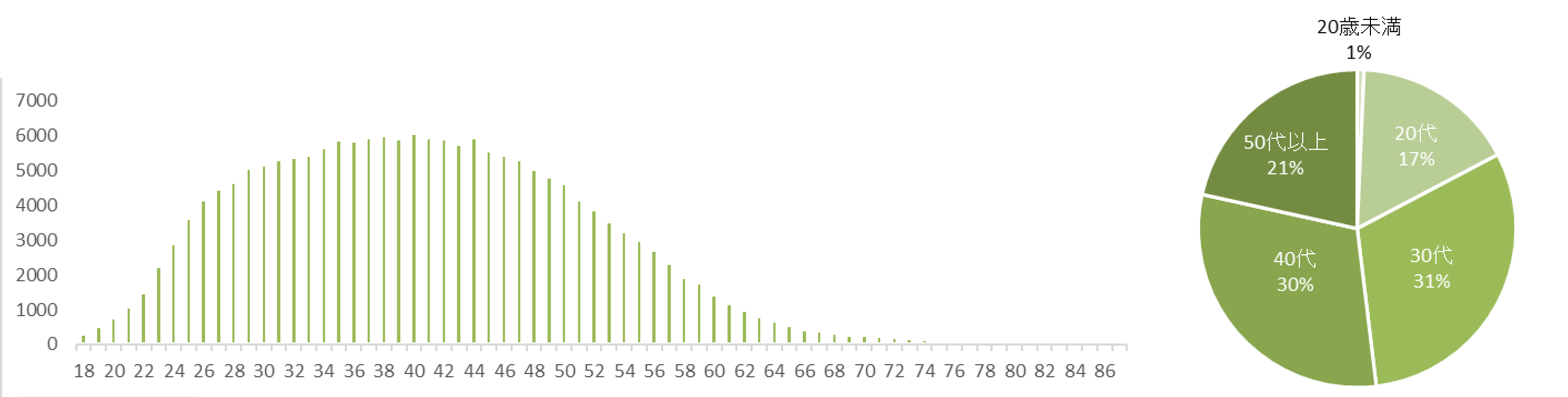 20万超の登録データを分析すると、TRANBIのユーザー分布の中心は40代に位置していることがわかります。