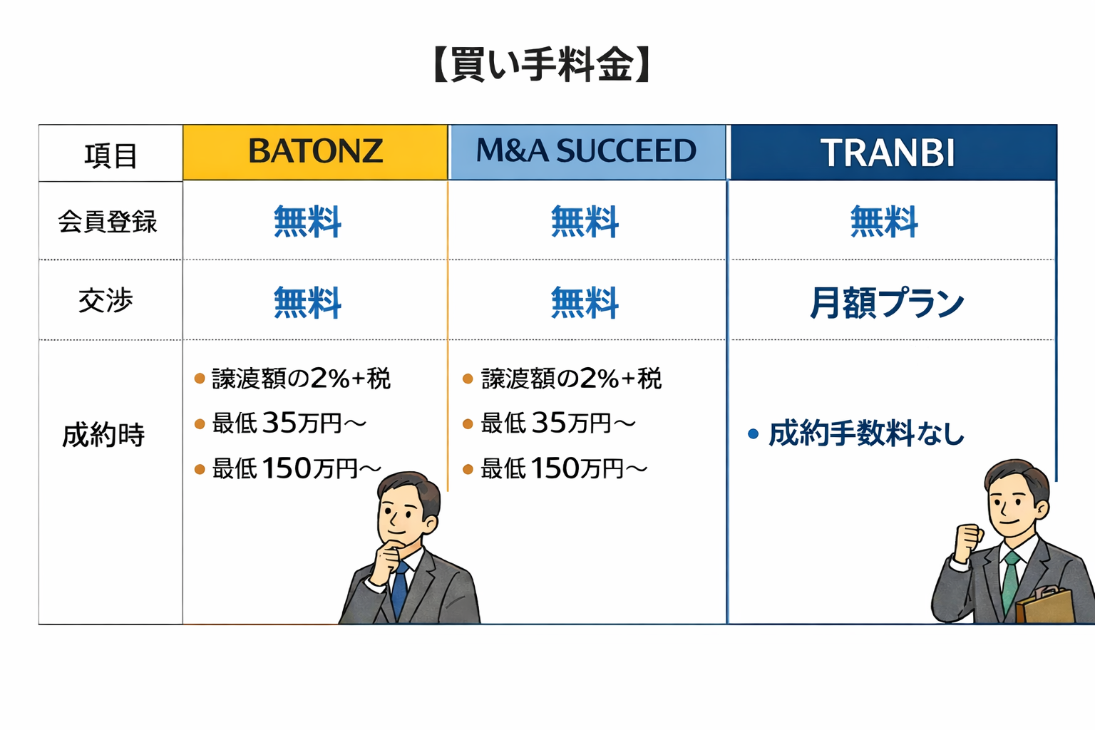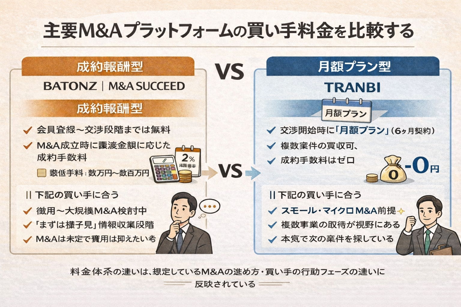 ここでは、代表的なM&Aマッチングサービスである、BATONZ、M&A SUCCEED、そしてTRANBIの買い手料金モデルを、考え方の違いという視点で整理してみます。