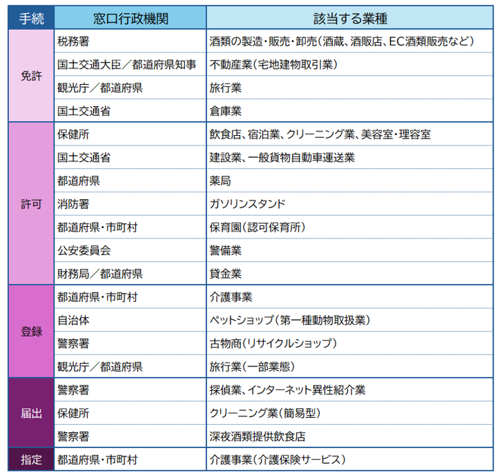 事業開始前に取得が必要なものが多く、無許可営業は処罰対象となる点が重要です。
