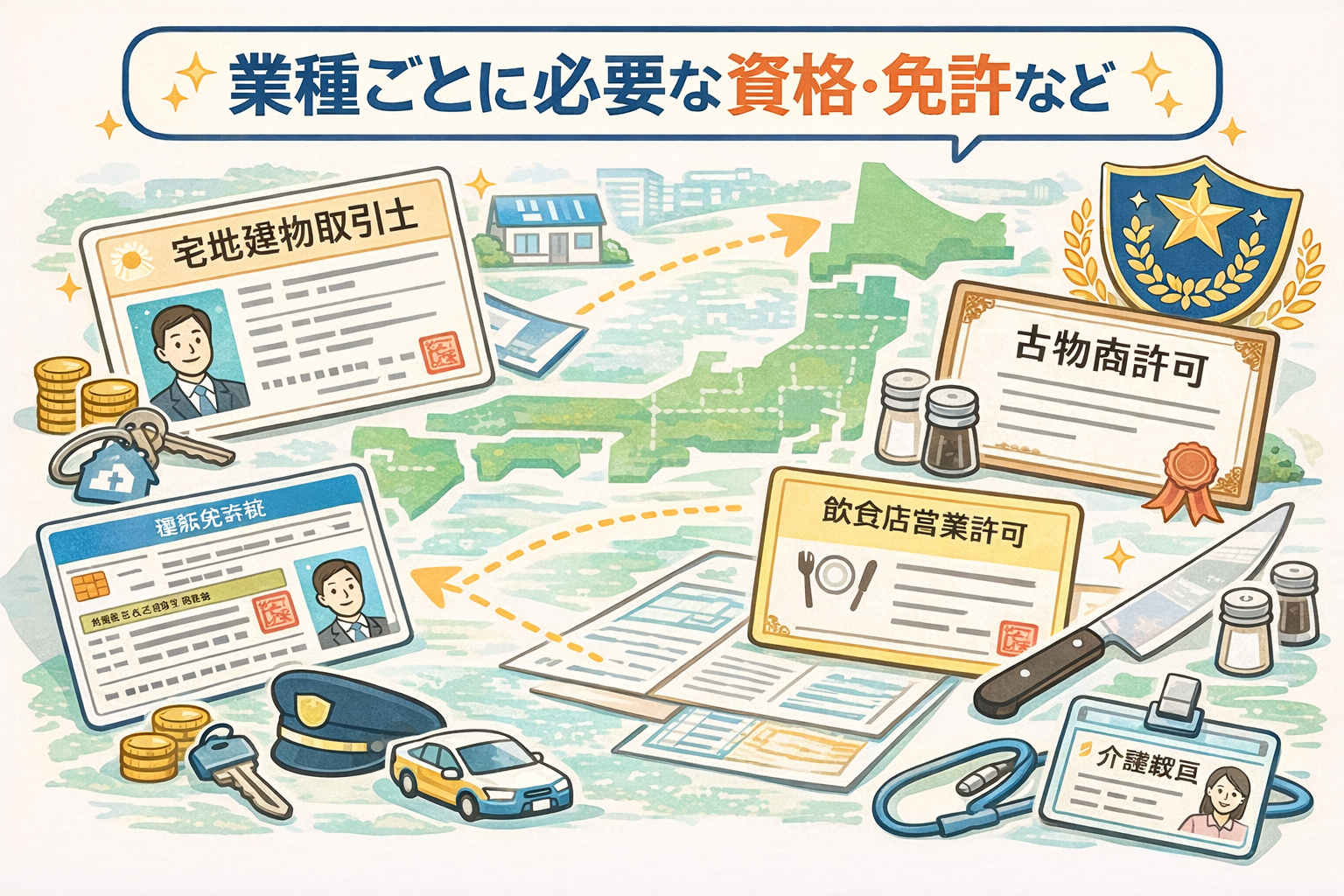 業種によっては、特定の資格を持つ人がいなければ始められないものや、行政から免許・許可・認可を受けなければ営業できないものもあります。