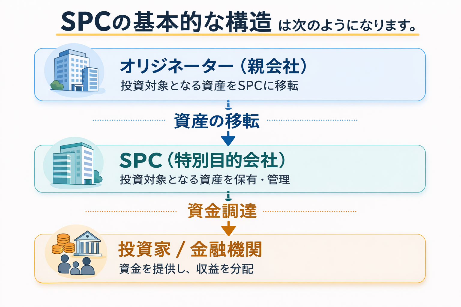 そこで、まずはSPCの基本的なスキームを図で確認してみましょう。SPCは、親会社(オリジネーター)と投資家、金融機関の間に位置し、投資対象となる資産や事業を管理する役割を担います。