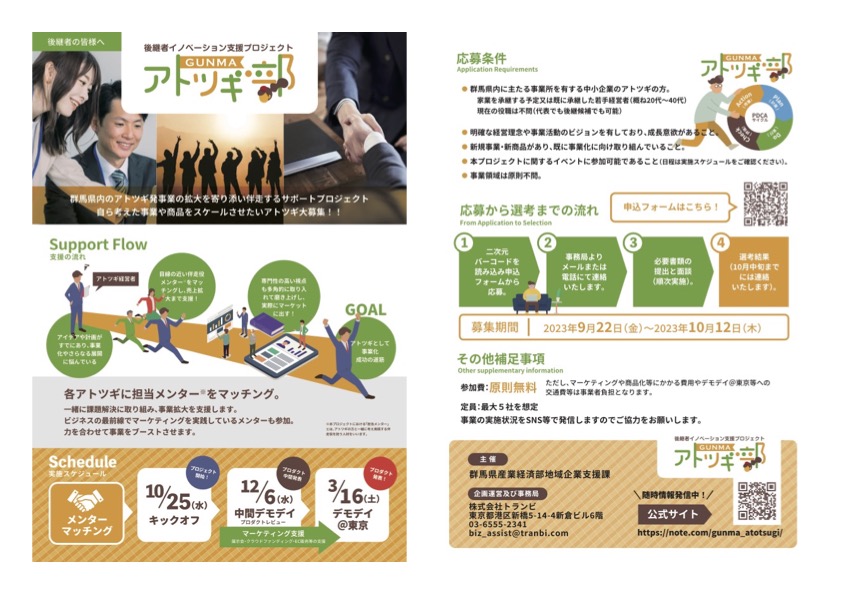 この度、日本最大級の事業承継・M&Aプラットフォームを運営する株式会社トランビ(本社:東京都 港区、以下「トランビ」)は、群馬県内の後継者(以下、「アトツギ」)の新規事業や新商品の拡大を伴走支援しアトツギの事業をブーストさせていく「アトツギ部」をスタートいたしました。2023年9月22日より支援を希望するアトツギの募集を開始いたします。